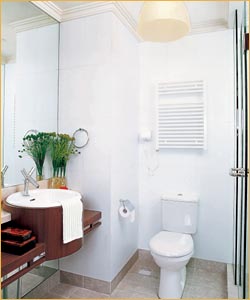 與淋浴間相對(duì)的墻面完全使用了鏡子,擴(kuò)大了小浴室的空間視覺(jué)感,鏡子前面做成了浴室架,上面安裝了臺(tái)式盆,這里可以梳洗打扮,邊上的綠色植物,成了整體設(shè)計(jì)中引人注目的亮點(diǎn),也為環(huán)境帶來(lái)了生氣。馬桶理所當(dāng)然地放在了正中。整體效果簡(jiǎn)單清新。