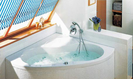 如果衛(wèi)浴間是全落地式斜屋頂或者是斜屋頂下方特別低,這時候可以選擇適合角度的三角形浴缸。這樣就避免了傾斜的角度,大大提高了其舒適性。