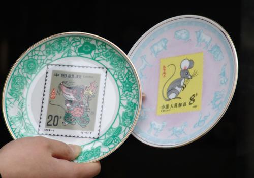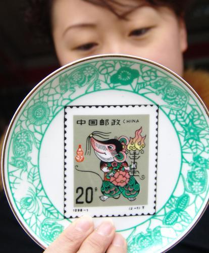 2008年1月25日,江西省景德鎮(zhèn)集郵公司,營(yíng)業(yè)員展示生肖鼠郵票藝術(shù)瓷盤(pán)。