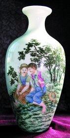 這件琺瑯彩瓷瓶高22厘米,口徑5.5厘米,底徑5厘米,薄胎,小盤口,釉色極其細(xì)膩光潤,并繪有一對西洋風(fēng)格的少男少女,顏色自然瑩潤。據(jù)鑒定專家介紹,琺瑯彩吸取了景泰藍(lán)制作的方法,在瓷質(zhì)的胎上,用各種琺瑯彩料描繪而成的一種釉上彩瓷,亦稱“瓷胎畫琺瑯”。琺瑯彩瓷的特點是瓷質(zhì)細(xì)潤,彩料凝重,色澤鮮艷明麗,畫工精致,m瑯彩于清代康熙中期燒制成功,至雍正時,得到進一步發(fā)展。雍正六年以后采用宮廷自己配制的彩料,色彩更加豐富,但雍正時期的傳世品多藏于故宮博物院內(nèi)。乾隆時期的琺瑯彩也很精致,除了白地琺瑯彩之外,還流行色地開光,圖案多繪有山水人物、花鳥紋、西洋婦女等,特別是人物像西洋油畫一樣富有立體感。后由于制作這種琺瑯彩瓷器極度費工,因此乾隆以后就銷聲匿跡了。