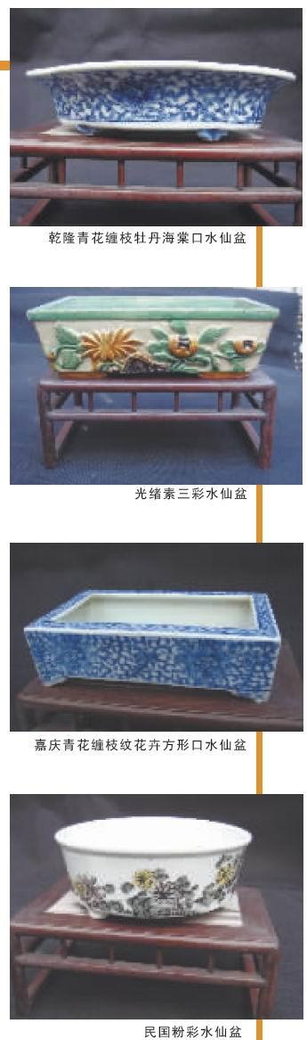 明清時期,水仙盆的造型更為豐富。胡桂標向我們展示的水仙盆包括清乾隆、清嘉慶、清光緒以及民國時期的制品,其口形多樣,除了圓形、方形等,還有造型別致的海棠式口,器口橢圓,呈四瓣花口,優(yōu)美異常。