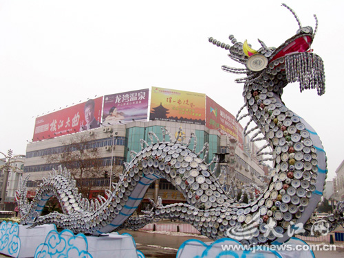昨日,一條迎春瓷龍在景德鎮(zhèn)市人民廣場亮相。這條瓷龍長20米,高5米,由一萬件瓷盤、瓷杯等拼接相連而成,為景德鎮(zhèn)增添了節(jié)日氣氛