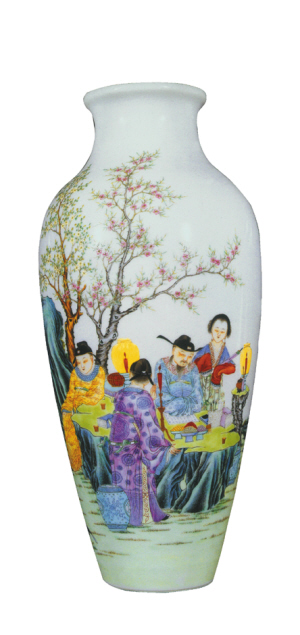 此瓶為典型的民國觀音尊式,肩膀瘦削,淺圈足。胎薄體輕,釉面潔白光潤。瓶身繪月下對飲圖,人物描繪精細(xì),須毫畢現(xiàn)。彩飾豐富,色調(diào)柔和。此器堪稱民國瓷器精品。