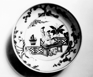 端詳盤面,映入眼簾的主題畫面,是瓷繪師所作的“二喬”。“二喬”的容貌,恰如耿寶昌先生所云的:“發(fā)髻高聳,臉龐豐滿,眉似彎月,唇似朱點(diǎn)”,如此貌美嬌媚的容顏,完全是一派國色天香的大家閨秀。細(xì)看衣著,細(xì)細(xì)的數(shù)根柔美青花線條,勾勒出綢料的輕盈,華貴而飄逸;巧妙地利用一小點(diǎn)一小點(diǎn)的青花,描繪成團(tuán)花,顯示了穿著的華服淡雅而秀麗。眉清目秀的“二喬”,同時(shí)側(cè)著臉注視著庭園的前方。她倆,引頸前探,仿佛在期盼著什么?又仿佛聽到了什么,真在凝神細(xì)觀……是否,由于放置在長桌中央的古琴,彈奏出的悲涼的樂曲,喚來了空谷知音,更希望逃逸出這陰森可怕的樊籠?