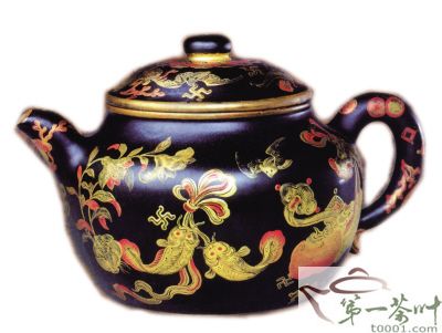 宜興窯紫砂黑漆描金吉慶有余壺 清乾隆