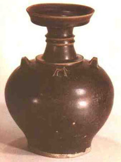 施黑色釉的瓷器。早在戰(zhàn)國時期浙江地區(qū)出現(xiàn)一種釉色為褐黑色的瓷器,由于黑的程度不夠,不被視為真正的黑瓷。到東漢后期,黑釉瓷器基本燒制成功。黑瓷是在青瓷的基礎上發(fā)明的,有的瓷窯既燒青瓷也燒黑瓷。黑瓷和青瓷釉色的呈色劑都是氧化亞鐵,恰當控制氧化亞鐵就能燒出美麗的黑瓷和青瓷。舉長石釉為例,在這種釉料中加入不同成分的氧化亞鐵,用還原火焰焙燒,能顯示不同的顏色。當氧化亞鐵控制在0.8%左右,顏色呈淡綠色;1%至3%左右是明亮的青綠色;5%左右是米黃色;8%左右就是赤褐色乃至暗褐色;如果這時把釉層加厚到1.5毫米左右,還原火焰又燒得很足,釉色就呈純黑,并發(fā)出美麗的光澤,這種質量的黑釉瓷器在東晉時期燒成了。唐代黑瓷產(chǎn)量大,北方唐墓中出土了黑瓷茶具。宋代風靡斗茶,為檢驗茶湯上的白色湯花,皇室倡導用黑釉茶盞,福建建窯成功地燒制出黑釉精品兔毫斑、鷓鴣斑的茶盞,還有一個特殊品種,在釉面油滴結晶體的周圍出現(xiàn)晶瑩的淡藍色暈光,奇妙無比,日本學者稱為“曜變天目”。黑釉茶盞的風行,引起全國一時間上下仿效,南北瓷窯競相生產(chǎn)。江兩、河南、山西、河北等省生產(chǎn)的黑瓷就有玳瑁斑、剪紙貼花、鐵銹斑等紋飾的藝術瓷。北方定窯黑瓷,造型精巧、在薄胎上施漆黑瑩潤的黑釉,再以金彩繪出花紋或鍍金口作為裝飾,莊重典雅、富麗堂皇、是黑瓷中的佼佼者。而百姓生活中使用的一般黑瓷則為粗瓷,選擇原料要求不高,甚至在一個瓷窯作坊里,用燒瓷的下腳料就能生產(chǎn)出價廉物美的黑瓷,供社會需要。(見如下圖)