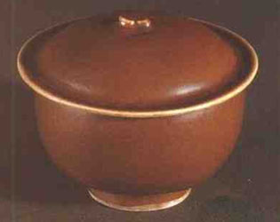 釉色為醬色、褐紅色、赭色、柿紅色的瓷器的通稱。醬釉瓷器是在青瓷基礎(chǔ)上出現(xiàn)的,它的呈色是釉料中含有較多的氧化亞鐵決定的。當釉料含氧化亞鐵達到5%左右時,釉呈米黃色;氧化亞鐵為8%左右,為赤褐色、暗褐色;如果燒成溫度比燒黑瓷高30~50度,釉色就成為醬褐色、芝麻醬色,而且穩(wěn)定精美。醬釉瓷和黑瓷工藝原理基本一樣,只是要求有較高的溫度。古代燒瓷由于窯爐結(jié)構(gòu)和燒窯技術(shù)的限制。提高溫度不容易,所以醬釉瓷出現(xiàn)比青瓷、白瓷、黑瓷略晚。醬釉瓷在唐代或唐代以前偶然燒成,但質(zhì)地較粗,尚未成為一個經(jīng)常生產(chǎn)的品種,估計可能是生產(chǎn)黑瓷時,部分器物因在窯里所處位置的溫度較高而出現(xiàn),到宋代醬釉瓷燒制成功,其中定窯、耀州窯、建窯、吉州窯產(chǎn)量增加,質(zhì)量穩(wěn)定,尤其是定窯的醬釉瓷,白色的胎體,精細的制作工藝,像熟透的紅柿子般的釉色,在宋代藝術(shù)瓷中獨具風采。宋代醬釉瓷器物有碗、盤、碟、瓶等,器形不大,品種和數(shù)量都比較少。明代景德鎮(zhèn)御窯廠以及清代的官窯都生產(chǎn)醬釉瓷,古樸渾厚,典雅優(yōu)美。宋元以來,民間使用的粗瓷從碗、盤到缸、甕都有醬釉瓷器種。(見下圖)