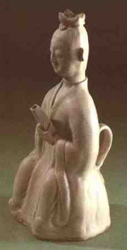 以河北曲陽澗磁村為中心的定窯作坊生產(chǎn)的瓷器、人稱北定,以區(qū)別其他地區(qū)定窯系的產(chǎn)品。明人田藝衡在《留青日札》中說:“定窯……色有竹絲刷紋者曰北定。”晚唐時(shí)期定窯學(xué)習(xí)邢窯工藝生產(chǎn)白瓷,經(jīng)過晚唐、五代的長足發(fā)展,到宋代生產(chǎn)出精美玲瓏的白瓷、黑瓷、綠瓷、醬釉瓷,即白定、黑定、綠定、紫定,后人將其評為宋代五大名窯之一。北宋滅亡以后,金代繼續(xù)生產(chǎn),到元代工藝衰落,轉(zhuǎn)而生產(chǎn)磁州窯類型的粗瓷。定窯的中心窯場在河北曲陽澗磁村和燕川村,漳河流域廣大地區(qū)都生產(chǎn)同類白瓷。北宋定窯制瓷工藝迅速提高,胎料加工精細(xì),加之原料成型穩(wěn)定性好,器物胎體很薄,很規(guī)整,沒有絲毫變形的現(xiàn)像。白瓷有的白度很高,即所謂粉定;有的白中泛黃,如象牙質(zhì)感;也有的略為泛紅,往往釉面有竹絲刷紋。由于釉層在高溫中浸潤流動(dòng),鐵、鈦等呈色金屬物質(zhì)有一些凝聚成乳絮條狀,有如淚痕。北宋中期以后,為提高產(chǎn)量,發(fā)明了覆燒工藝。瓷坯入窯不用匣缽,而用胎泥作為支圈墊燒,一個(gè)支圈扣一個(gè)坯件,層層相迭,比用匣缽裝坯節(jié)省80%的空間。支圈用胎泥作成,在窯中焙燒的膨漲收縮系數(shù)都和坯件一致,形成粗糙的芒口,于是用鑲金口、銀口、銅口的工藝加以裝飾,叫作“釦器”。瓷胎裝飾也很精致,早期多用劃花、刻花。花紋有蓮瓣、牡丹、萱草、蔓草、鴛鴦、雙鴨、雙鵝、水波雙魚、三魚、四魚等。畫面簡潔,刀法嫻熟,線條挺拔,剛勁有力。晚期多印花裝飾。紋飾有云龍騰躍、鳳穿牡丹,有像宋代織錦上構(gòu)圖嚴(yán)謹(jǐn)?shù)膱F(tuán)花圖案,也有采用對稱、散點(diǎn)等手法由朵花組成圖案的。定瓷還用金彩作裝飾,“金花定碗”是定窯的名貴品種,金彩裝飾既出現(xiàn)在白定上,也出現(xiàn)在紫定和黑定上。定瓷還有一些雕塑作品,如牛車、人物和各類動(dòng)物,如小猴、小雞、小獅、小狗、金龜、小兔、海螺等。有的作品采取捏塑與捺印結(jié)合的工藝完成。北京故宮博物院珍藏的白瓷孩兒枕,就是定窯白瓷塑的代表作。枕為俯臥的嬰兒形,肌肉豐腴,眉清目秀,頭微上揚(yáng),一手臂托下頦,另一手撫繡球,身著短衣長褲,身下的床榻撩印各種表示木雕花紋的圖案。有的定瓷還用黑彩點(diǎn)畫,如牛車、轎子。有的用黑褐彩書寫“菜玉”等字樣。有的刻寫文字款識(shí),如“官”、“新官”、“南食局”、“尚食局”、“五王府”等,這表明定瓷精品為最高統(tǒng)治者所使用。(如下圖)
