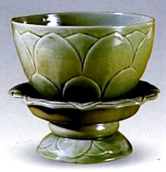 盞托連為一體,為唐至宋時(shí)期典型茶具。通體施青釉,釉色瑩潤(rùn),光潔如玉,系五代吳越國(guó)錢氏秘色窯燒造,奉至蘇州虎丘云巖寺塔供佛。通體飾大蓮瓣紋,花紋與器型達(dá)到完美統(tǒng)一。