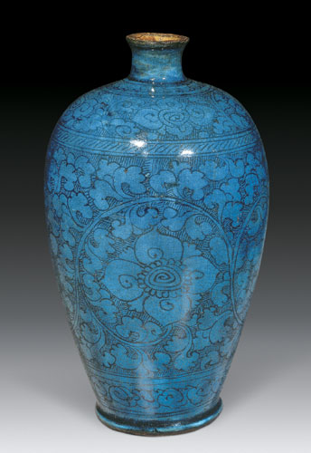 “孔雀藍(lán)釉”屬于西亞地區(qū)的傳統(tǒng)釉色,其制品在唐宋期間的商貿(mào)往來時(shí)被帶到中原并在金、元民窯中陸續(xù)制作。大同金代閻德源墓出土的一對孔雀藍(lán)黑花玉壺春瓶是我國較早期的孔雀藍(lán)制品。從金、元產(chǎn)品工藝看,13世紀(jì)的磁州窯系翠藍(lán)器(圖4-1)水平相對較高,至今有不少繪畫精美的“翠藍(lán)黑花”器存世。(編者注:隨著桂林明靖江王陵墓群出土孔雀藍(lán)黑花梅瓶實(shí)物面世,結(jié)合器形演變,以往定為元代的一些孔雀藍(lán)黑花器被現(xiàn)今研究界明確定為明代產(chǎn)品。)需要特別指出,有關(guān)學(xué)者根據(jù)科學(xué)成分分析發(fā)現(xiàn)該類制品使用低溫石灰釉,與我國傳統(tǒng)上以氧化鉛為助融劑的低溫釉配方并不一致,因此推斷該類色釉極可能是引進(jìn)西亞地區(qū)的原始配方,這也解釋了孔雀藍(lán)釉的原始起源問題。