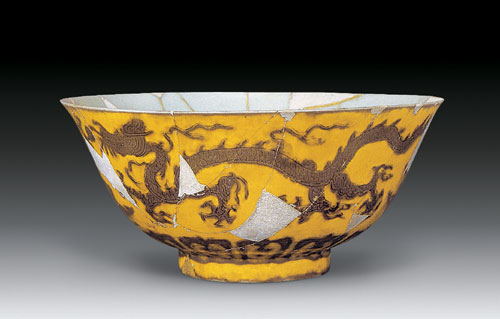 (明成化黃地紫龍紋碗,景德鎮(zhèn)珠山御廠出土。)