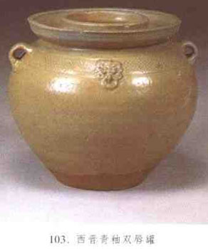 又稱復(fù)口罐、雙口罐,流行于東漢末至南朝時期的一種罐式,多出土于江南地區(qū)。造型為雙重口,內(nèi)口直,外口略低于內(nèi)口且外侈,溜肩,圓腹,腹下內(nèi)收,平底、與今泡菜壇形狀相似。從出土情況看,西晉以前的雙唇罐器身較矮,肩部飾有扁條狀豎系、橫向半環(huán)形四系;東晉以后,器身增高.內(nèi)口直徑較大,肩部亦有半環(huán)形系。(見圖103)