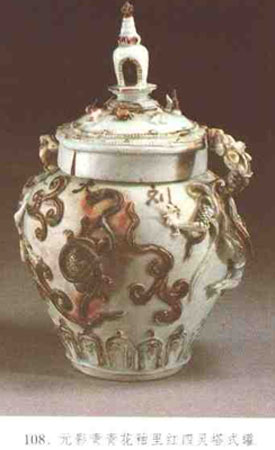 帶有宗教含義的一種罐式。出現(xiàn)于元代,是從唐代塔式罐發(fā)展而來的。江西省博物館收藏的元青花釉里紅四靈塔式罐,平口,短頸,溜肩,腹部下收,平底,腹部貼塑青龍、白虎、朱雀、玄武“四靈”。帽形蓋覆于罐口,蓋頂作喇嘛塔形,塔基為六棱形須彌座,塔龕內(nèi)有一尊佛像,塔剎的根部有仰蓬瓣紋。(見圖108)
