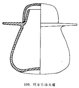 流行于明、清的一種罐式。明永樂時期創(chuàng)燒,因罐體似卷軸畫的軸頭而得名。造型為上小下大,斜直腹,圈底內(nèi)凹,頸、腹之間有板沿,弧形帽式蓋。清康熙、雍正朝多有仿制。(見圖109)