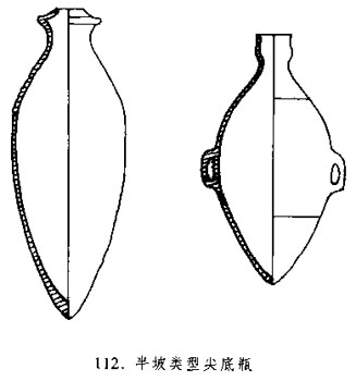 新石器時代陶器,仰韶文化半坡類型最具代表性的器物之一。汲水器。紅陶質(zhì),手工制作。器形為小直口,細(xì)頸,長圓腹,尖底.肩部或腹部有對稱的雙系,用以穿繩。器表多有繩紋。燒結(jié)程度較好,質(zhì)地堅(jiān)實(shí)。汲水時由于重力作用,瓶口會自然向下,待水將滿時,瓶身自動倒轉(zhuǎn),口部向上。仰韶文化廟底溝類型及馬家窯文化遺存中發(fā)現(xiàn)的尖底瓶略有不同。廟底溝類型的尖底瓶為雙唇,小口,器身瘦長,肩腹部無系。馬家窯文化的尖底瓶為侈口,直頸,折肩,腹有雙系,以細(xì)泥橙黃陶制成,器表涂淺紅色陶衣,以黑彩繪旋紋,紋飾充滿動感,制作精細(xì)。(見圖112)