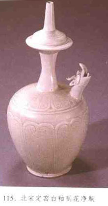 佛教憎侶“十八物“之一,游方時(shí)可隨身攜帶以貯水或凈手。它淵源于佛國印度,后隨佛教傳入中國、日本、朝鮮及南洋群島諸國。梵語音為“捃雅迦”、“君遲”、“軍持”,中譯為瓶或澡瓶。瓷質(zhì)凈瓶流行于唐、宋、遼時(shí)期。造型為管狀細(xì)長頸,頸中部凸出如圓盤,長圓腹,圈足,肩部上翹的短流多作瑞獸首形。元、明以后多稱“軍持”。器身多扁圓,頸較短,流肥碩。入清以后,這—器形為皇家壟斷,演變?yōu)橹鳖i,豐肩.?dāng)扛梗呷ψ阃馄踩缟w展開,無流,成為清朝廷賜給西藏高級僧侶插草供佛之物、故又改稱“藏草壺”。(見圖115)