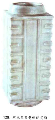 仿新石器時(shí)代玉琮造型的一種瓶。圓口,短頸,方柱形長(zhǎng)身,圈足,口、是大小相若,有的器身四面凸起的橫線(xiàn)裝飾。最早的瓷質(zhì)琮式瓶見(jiàn)于南宋官窯與龍泉窯器。明代石灣窯此類(lèi)造型多施月白釉。入清之后,器身橫線(xiàn)裝飾演變?yōu)榘素约y,故后期又稱(chēng)為“八卦瓶”。(見(jiàn)圖120)