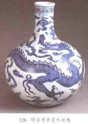 瓶式之一,是受西亞文化影響的器形?谖⒊蓿鳖i,球腹,平底。始見于明永樂朝,宣德器較永樂略顯粗放,此后明代各朝未出現(xiàn)。清代康熙朝仿古之風(fēng)盛行,天球瓶則多仿明初之器;雍正、乾隆時(shí)較為流行,多署本朝年款。(見圖126)