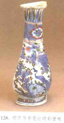 專(zhuān)為懸于壁上或掛于轎中設(shè)計(jì)的瓶式,又稱(chēng)“掛瓶”或“轎瓶”,始見(jiàn)于明代宣德朝。瓶體均為整體的半剖,背面平整有穿,可系繩懸掛。初掛于鳥(niǎo)籠之中。萬(wàn)歷時(shí)大興,有蓮花、葫蘆、瓜棱、膽式等多種形制,清代乾隆官窯多有生產(chǎn),造型規(guī)整,工藝精巧、品種豐富,并多附御題詩(shī)句。(見(jiàn)圖128)