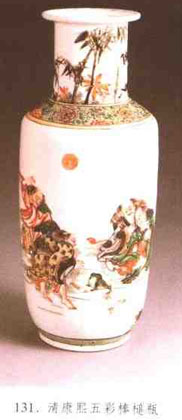 瓶式之—,因似舊時(shí)洗衣用的木棒槌而得名。多為清康熙民窯所燒。棒錘瓶又分圓、方、軟。圓棒槌又稱硬棒槌,造型為盤口,直頸較短,圓折肩,筒形長(zhǎng)腹,底部多為平切式二層臺(tái)。器形大小不一,大者高達(dá)70厘米,小的不足10厘米。方棒槌瓶又稱方瓶、器形為撇口、短頸,平肩微折,方形長(zhǎng)腹,腹部略為上寬下窄,方形寬足,凹底施釉。軟棒槌瓶特指雍正初期所燒制的一種器形,是與硬棒槌相對(duì)而言,造型不及后者挺拔。器口外侈,束頸,溜肩,直筒形腹,腹下略收。清光緒及民國時(shí)期對(duì)方棒槌瓶仿造較多。然仿品胎體比較厚重,口邊較薄且不規(guī)整。(見圖131)