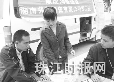 2月24日上午,一家湖南陶瓷企業(yè)在南海獅山松夏工業(yè)園A區(qū)擺攤設(shè)點(diǎn)大批招工,而且開出的待遇條件不低于佛山本地企業(yè),吸引了不少剛返城的南下民工咨詢、填表報名。上午10時許,記者來到松夏工業(yè)園A區(qū)看見,一工廠的旁邊插著一把太陽傘、放著一張辦公臺,墻上和旁邊的一輛面包車上都掛著一條寫著“湖南××陶瓷有限公司招工點(diǎn)”的宣傳橫幅,辦公臺邊掛著一張招聘啟事,上面介紹招工職位和工資待遇,兩名男性工作人員在現(xiàn)場忙著向路人和圍觀者推介該企業(yè)的各項優(yōu)惠措施,不時有人前來咨詢報名,幾乎都是外地人。記者仔細(xì)看了看招聘啟事,啟事上寫的工資待遇、工作生活環(huán)境都相當(dāng)優(yōu)厚,不亞于佛山本土企業(yè),其中最低薪酬的文員和保安員職位每月也有1100元至1500元,最高薪酬的班長職位每月3500元,一般的職位每月都有1500元至2000元左右。