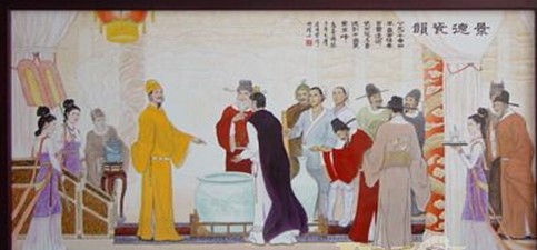 中國瓷都景德鎮(zhèn),是舉世公認(rèn)的東方古文化象征之一。正當(dāng)瓷都籌備迎接2004年景德鎮(zhèn)冠名千年之際,中年畫家詹明榮為“千年慶典”所創(chuàng)作的瓷版人物畫《景德瓷韻》問世。近2米長的大型瓷版上,映入眼簾的是一派金碧輝煌的金鑾寶殿,黃袍金帶的宋真宗趙恒與臣僚們正在欣賞稱贊由江西浮梁縣昌南鎮(zhèn)上貢的極品———“影青釉”大龍缸和薄如蟬翼的薄胎長頸瓶……畫家以生動傳神的美術(shù)語匯與人物形象,表現(xiàn)了一個莊重與雄輝的歷史真實(shí)和文化光點(diǎn);鮮明而藝術(shù)地詮注了“景德鎮(zhèn)”的產(chǎn)生由來。