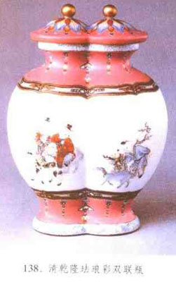 瓶式之一,流行于清代,因兩瓶聯(lián)成一體而得名。通常是兩瓶的腹部粘連在一起或自口至底通體相連。市場(chǎng)上出現(xiàn)的仿制品中,有書“大明萬(wàn)歷年制”楷書款的。(見(jiàn)圖138)