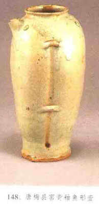 唐至五代時(shí)期流行的壺式之一。整體作并聯(lián)的雙魚形,雙魚嘴為壺口,魚體作壺身,魚尾為假圈足。魚背脊間各有凹槽,槽上下兩端貼有橋形系,可系繩.故又名雙魚穿帶壺。陶、瓷質(zhì)雙魚壺是受金銀器影響后出現(xiàn)的新品種。唐代越窯青瓷和三彩陶制品較多。1983年廣東梅縣出土唐代水車窯青釉雙魚壺,壺口外敞,魚形腹,圈足仿魚尾,肩部一側(cè)裝管形短流,雙魚之間有一凹槽、上下各設(shè)一系,足上部有穿孔,制作簡(jiǎn)練。1964年河北井陘縣出土五代時(shí)期的白釉雙魚穿帶壺,雖然雙魚的基本特征均有細(xì)致的刻畫,但與唐代相比、缺少了簡(jiǎn)練、生動(dòng)的效果。(見(jiàn)圖148)