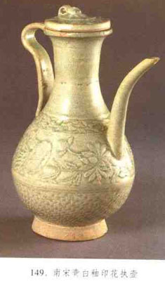 隋代出現(xiàn)的酒器之—,又稱注子、注壺。據(jù)唐李匡《資暇集》“注子偏提”條云:“元和初,酌酒猶用樽杓。……居無何,稍用注子,其形若罌,而蓋、嘴、柄皆具。”唐前期注子有盤口,短頸,鼓腹,圓筒形或六角形短直流,曲柄。唐晚期僅越窯燒造的注子樣式就有5種之多。腹部多作瓜棱形,有短流、長流、曲柄、直柄等數(shù)種。五代至北宋,器身漸高,通體多壓4至6條瓜棱,流漸趨細(xì)長微曲,曲柄高于壺口、平底變?yōu)閳D圈足。器形修長秀美,并多有注碗相配,注碗稍大于注腹,因內(nèi)盛熱水用以溫酒,又稱“溫碗”。習(xí)慣上對(duì)于宋代的注子稱為執(zhí)壺、宋代壺式有10余種,腹部多作瓜棱形,器身趨于瘦長.流和柄上端高度相等,此外尚有獸流壺、提梁壺、葫蘆式壺等。元代壺身多為玉壺春瓶式,彎流與壺頸之間以S形飾件相連。明、清之后,執(zhí)壺造型增多,并多作茶具。(見圖149)