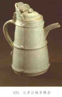 元代創(chuàng)新壺式之一,由蒙藏民族貯放奶液的金屬或木質(zhì)器皿演變而來。器形為簡(jiǎn)式,上收下敞?诓靠勘粋(cè)有花冠形裝飾,柄兩端各有卷曲花飾、方式壺流,矮足,足脊寬平無釉。壺體上有仿金屬箍和鉚釘狀裝飾。1963年北京市崇文區(qū)元鐵可墓出土的一件是國內(nèi)僅存的完整器。(見圖151)