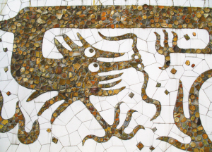 梅文鼎大師用采自貝丘遺址、奇石古窯址和南風古灶窯址的陶片砌成的壁畫《瑞龍獻寶》。本報記者 周春 攝