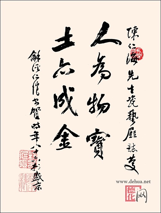 沈陽故宮博物院老院長、國家文物鑒定委員會副主任楊仁愷先生八十六歲時給陳仁海題詞:“人為物寶,土亦成金”。楊老的題詞,既精辟的道出了藝術(shù)價值的決定因素是人,是夠得上“物寶”的人,又精煉的概括了陳仁海成就藝術(shù)高峰的內(nèi)在原由。