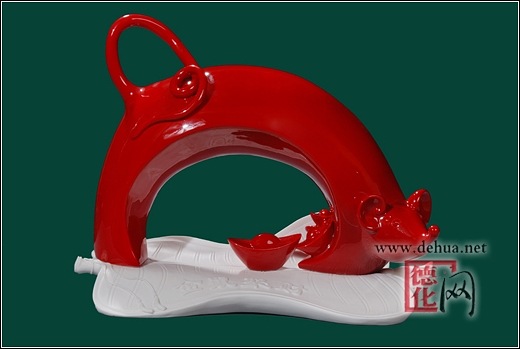 又例如:陳仁海設(shè)計制作的2008年鼠年紀(jì)念瓷,一款以端坐在似鳥巢又似元寶之上的“鼠擊鼓而樂”為造型,通體潔白如玉,取名“子來福到”,名自《詩&S226;大雅&S226;靈臺》:“經(jīng)始勿亟,庶民子來”,謂民心歸附,如子女趨事父母,不召自來,表達了全國上下萬眾一心,共建和諧社會的生動局面;一款以卡通紅鼠聚財為造型,作品主體紅如火焰,喜氣洋洋,取名“金鼠聚財”,寓意人們財富增加,幸福安康。