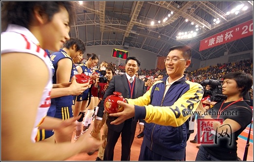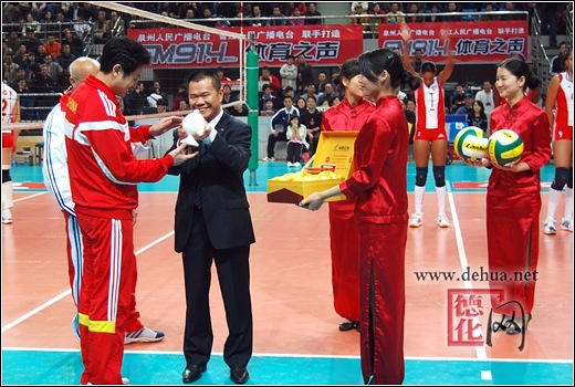 【德化網(wǎng) 訊】 2月25日、26日,在晉江和集美舉行的兩場2008中國女排國際對(duì)抗賽上,德化名瓷首次亮相國際女排賽場,卓越陶瓷有限公司成為晉江中古女排對(duì)抗賽協(xié)辦單位和指定禮品,盛世·國寶“富貴紅”成為集美賽事的戰(zhàn)略合作伙伴和唯一指定禮品、獎(jiǎng)杯?h領(lǐng)導(dǎo)涂健圻、黃國慶、林華武、黃耀昆、溫文英等到集美賽場觀看了比賽并為球員頒獎(jiǎng),“中國瓷都·德化”廈門富貴紅營銷中心組織員工組成近百人的拉拉隊(duì)方陣高舉盛世·國寶“富貴紅”牌匾為中國女排吶喊助威。