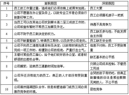 “如果你想穩(wěn)住你的銷量,首先你必須有一支能征善戰(zhàn)而又穩(wěn)定的營銷隊伍。怎樣穩(wěn)住你的隊伍,你得給員工以不走的具有競爭力的理由,也就是說,員工在你這里可以得到什么?美國企管顧問史密斯根據他多年的顧問經驗,總結出員工離職的十大原因,大致為: