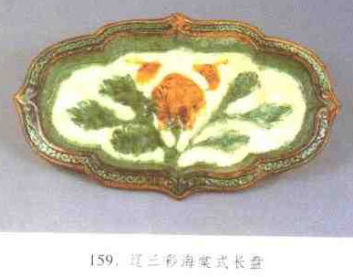 遼瓷典型器之—。全器若海棠花形,盤面較扁長(zhǎng)、折沿、淺腹、平底,多以三彩印花裝飾。瓷制品源于木制餐具。這種器物也常見于遼墓壁畫。(見圖159)