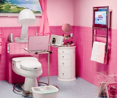 這是一款女性版豪華盥洗室,由美國Roto-Rooter潔具公司推出。其整體色調(diào)為粉紅色:“公主們”可以坐在粉紅色“寶座”(馬桶)上,一邊吹頭發(fā),一邊泡腳,一邊打開粉紅色的Sony筆記本上網(wǎng),或者玩WiiTennis( 日本任天堂生產(chǎn)的一款運(yùn)動(dòng)游戲機(jī)),而且對(duì)于很多女性朋友來說,既是電視、鏡子,又是毛巾架的多功能屏幕,更是不可多得的“寶物”,此前該公司曾推出男性版超級(jí)盥洗室,其中配置的電視屏幕是女性版的4倍大。