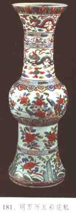 、偬召|(zhì)酒器。始見于新石器時代,夏商較為流行,早期器形為喇叭形侈口、細腰、高身、平底。商代后期有的為圈底,下附圈足。商周時代青銅觚流行,陶觚多為仿制。用作陪葬冥器。②仿青銅觚的瓷質(zhì)花瓶,稱“花觚”。流行于元、明、清時代。器形仍為敞口細身、圈足,明代花觚器身直下,清康熙以后腰部凸出,另有一種器形,器身較粗壯,長頸、高圈足,鼓出的小圓腹四周凸起四道棱戟。有青花、斗彩、單色釉等品種,有的在器腹部裝飾堆貼或印花紋飾。乾隆、嘉慶年間所制還有一種細身的觚,腰際堆塑—條蟋螭、施素三彩釉。(見圖181)