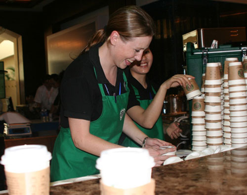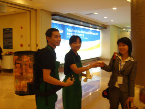 除了休息區(qū)里面服務(wù)周到外,在會(huì)場(chǎng)通道里,星巴克也不放過(guò)一個(gè)機(jī)會(huì)進(jìn)行自我品牌的營(yíng)銷,他們的方法并不是簡(jiǎn)單地掛牌宣傳和招募人員發(fā)送宣傳資料,而是非常具有親和力地走到人群中間用非常趣味性的方式讓人們免費(fèi)品嘗咖啡。一男一女兩個(gè)帥哥美女,男的背個(gè)五彩的咖啡桶,女的手拿小紙杯,咖啡雖然是簡(jiǎn)單的黑咖,但是當(dāng)人們看到這樣友好輕松的服務(wù)的時(shí)候,已經(jīng)不在意其咖啡味道了,而品牌的推廣則已經(jīng)深入人心了。