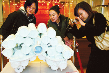 在展廳里走走看看,就像到了一個想象飛舞的創(chuàng)意世界。瞧,美國藝術家丹·貝爾把一堆杯狀廢棄物組合在一起,裝窯、澆釉、燒結,最終變廢為寶,成了一件藝術精品,有了“只在此山中,云深不知處”的韻味。