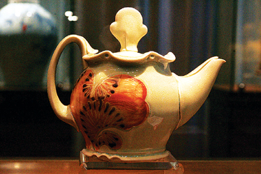 還有一些作品外形卡通,引起許多少兒觀眾的喜愛。比如《霜打的狗兒》,白色的“霜枝”覆蓋在棕色的哈巴狗頭上,鳥兒逗弄慵懶的狗兒,畫面栩栩如生。壺、碗,被印上大象、松鼠等可愛的圖案;籃子長得像企鵝,盤子下長著像八爪魚那樣的“腿”。