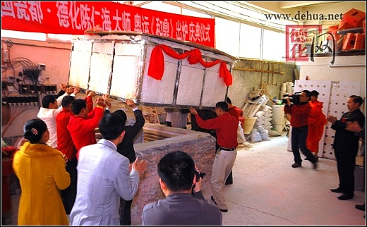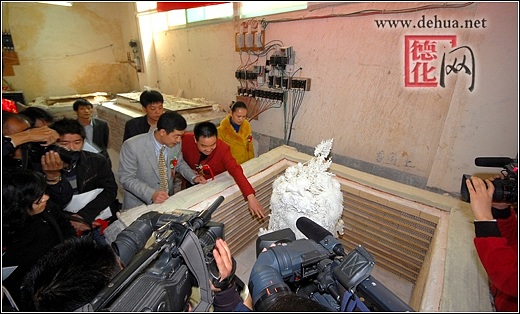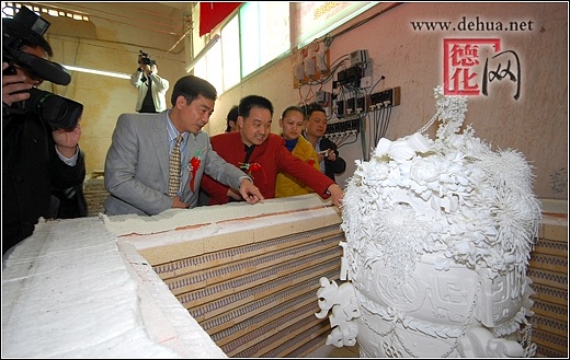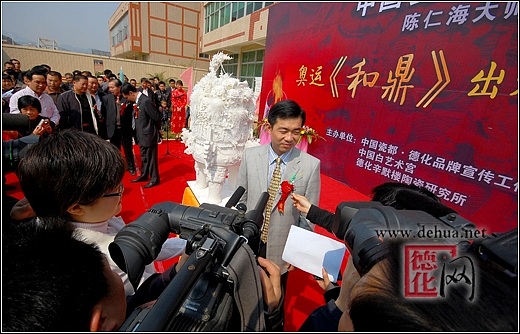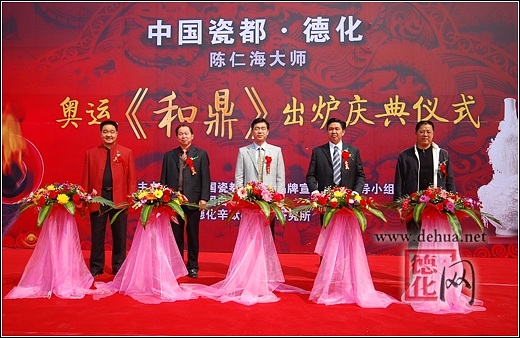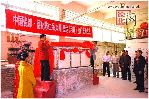 【德化網(wǎng) 訊】 2008年北京奧運(yùn)會(huì)即將舉行,舉國歡慶,舉世瞻目。3月6日,“千年一寶·奧運(yùn)《和鼎》”出爐慶典儀式在中國瓷都德化隆重舉行。這是德化陶瓷巨鼎的首次問世,也是對2008北京奧運(yùn)會(huì)的又一次隆重獻(xiàn)禮。德化縣人民政府縣長李輝躍,中共德化縣委常委、宣傳部長涂健圻及中國陶瓷工業(yè)協(xié)會(huì)副理事長黃發(fā)建、福建省陶瓷專業(yè)委員會(huì)秘書長張南章等領(lǐng)導(dǎo)嘉賓共同見證了這一歷史性時(shí)刻。