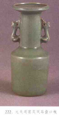 瓷器耳的一種式樣,即器物的耳作成鳳形。最早見于宋代龍泉窯青瓷瓶上,其造型為盤口、細(xì)長頸、折肩、直腹。頸部置對稱的雙鳳耳。日本人阪和泉久保傯紀(jì)念美術(shù)館收藏的一件龍泉窯青瓷雙鳳耳瓶被定為日本國寶。清代景德鎮(zhèn)窯瓷器上亦有所見。如康熙茄皮紫釉鳳耳蒜頭口瓶、乾隆豆青釉青花鳳耳瓶等。(見圖222)
