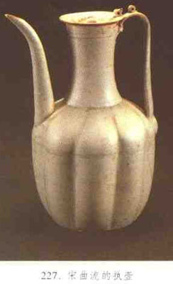 陶瓷容器流的—種形式,圓管狀,細長而微曲,略呈S形。流口稍向外撇、斜削成尖圓形、便于控制水流的角度和力度。宋代的執(zhí)壺和明清的酒壺及部分茶壺均采用這種流,—般安裝在器腹中下部,后代有的還在流末端至肩部加一微曲或略帶花飾的扁橫梁,起加固和裝飾作用。(見圖227)