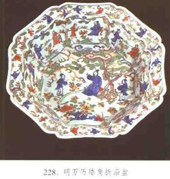 又作“委角”。方形瓷器轉(zhuǎn)角的一種裝飾形式,有幾種樣式:常見的是將直角變?yōu)閮?nèi)凹雙弧線;或?qū)⒅苯亲兂蓤A角;也有的將直角斜削45度,變四方形為八角形。倭角常出現(xiàn)在方形盤、盒、瓶等器物上。(見圖228)