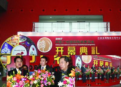 3月18日上午9點半,“2007中國廣州國際陶瓷展覽會”開幕式在中國出口商品交易會琶洲展館珠江散步道隆重舉行。中國對外貿(mào)易中心(集團)代表、中國對外貿(mào)易廣州展覽公司副總經(jīng)理馬國勤、中國輕工業(yè)聯(lián)合會副會長、中國陶瓷工業(yè)協(xié)會理事長楊自鵬,潮州市市委書記駱文智,潮州市市長湯錫坤,湖南省商務廳副廳長周船,廣西商務廳對外貿(mào)易處處長顧章偉,福建省德化縣副調(diào)研員黃發(fā)建,香港陶瓷商會會長陳國柱等領導出席了開幕式。河北唐山、邯鄲,山東臨淄、臨沂,江蘇南京、宜興,江西景德鎮(zhèn),重慶等重要陶瓷產(chǎn)地的代表也參加了開幕式。