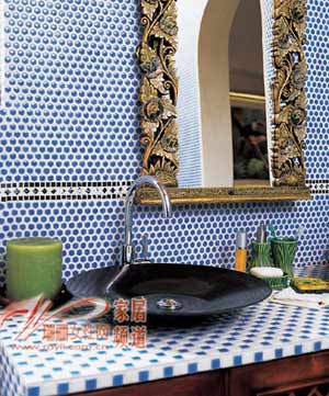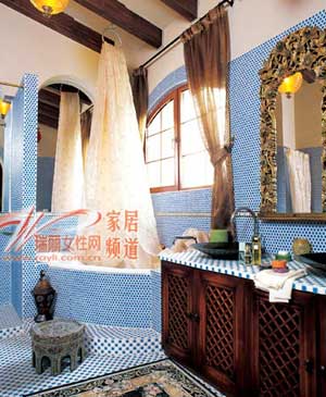 精心拼貼的藍(lán)色瓷磚從墻壁一直延伸到地面上,體現(xiàn)出波斯風(fēng)格偏愛大面積色彩裝飾的特點(diǎn)。拱形結(jié)構(gòu)在不大的空間里反復(fù)出現(xiàn),這種形式,正是波斯風(fēng)格的典型特征。確定了整體基調(diào)后,細(xì)節(jié)也不能忽略:洗手池下的儲(chǔ)物柜門板上的方格,浴室的地面鋪上色澤淡雅的厚剪絨毯,浴缸旁邊的八角銅凳,既是精美的擺設(shè)也是實(shí)用的家什。