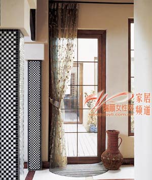用黑白相間的馬賽克包埡口,從材質(zhì)和色彩上與金色半透明的紗簾形成了鮮明而又和諧的對(duì)照。為了防止脫落,在鋪貼的時(shí)候一定要注意找工藝比較好的工人。
