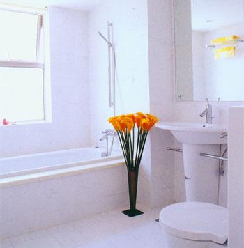 同樣為合理利用空間起見(jiàn),浴室配置的選用,很考驗(yàn)主人的智慧。鏡柜和底柜充實(shí)豐滿的浴室家具,可以將衛(wèi)生間中常用的洗面乳、牙刷杯、剃須刀等瑣碎之物都隱藏在鏡子的后面,同時(shí)也可以將其他使用周期稍長(zhǎng)的洗滌清潔用品整齊地收藏在面盆下面的小柜中;占地小的分體座廁,既省地又省錢(qián);長(zhǎng)度在1.5米以下的浴缸,深度往往比一般的浴缸深,由于缸底的面積小,往往是更節(jié)約空間的選擇。此外如掛墻式淋浴龍頭、靠角臺(tái)面、單孔臉盆龍頭等,節(jié)省空間且現(xiàn)代味十足。