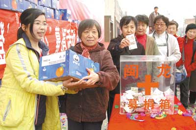 買橙子,幫助受災(zāi)果農(nóng)解決了賣果難的問題,將橙子作為愛心禮物贈(zèng)予愛心人士,募捐善款用于災(zāi)區(qū)重建,一份愛心雙倍放大。閩龍的“‘橙’獻(xiàn)愛心”活動(dòng)得到了與會(huì)領(lǐng)導(dǎo)的充分肯定,北京市紅十字會(huì)劉艷君秘書長在百忙中親臨現(xiàn)場(chǎng),帶頭捐款。在領(lǐng)導(dǎo)的帶動(dòng)下,參賽運(yùn)動(dòng)員、現(xiàn)場(chǎng)工作人員、市場(chǎng)內(nèi)部員工及商戶積極參加募捐,共籌得善款10310元,已全部上交市紅十字會(huì)用于災(zāi)區(qū)重建。